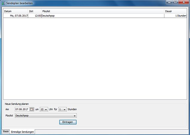 Du kannst Sendungen für die einmalige Ausstrahlung zu einer bestimmten Zeit an einem bestimmten Datum planen. Öffne dazu zunächst den Sendeplan-Editor wie hier beschrieben und wechsele auf den Tab .